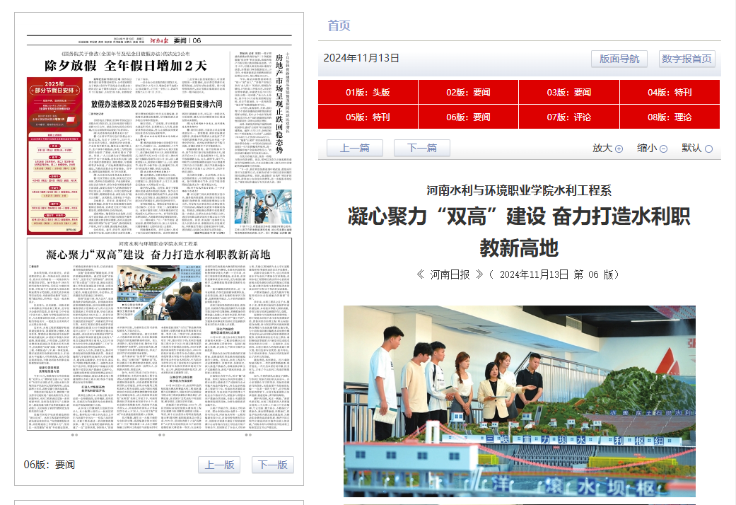 11月13日,河南日报06版以《凝心聚力“双高”建设 奋力打造水利职教新高地》为题,对我校水利工程系工作亮点进行报道。