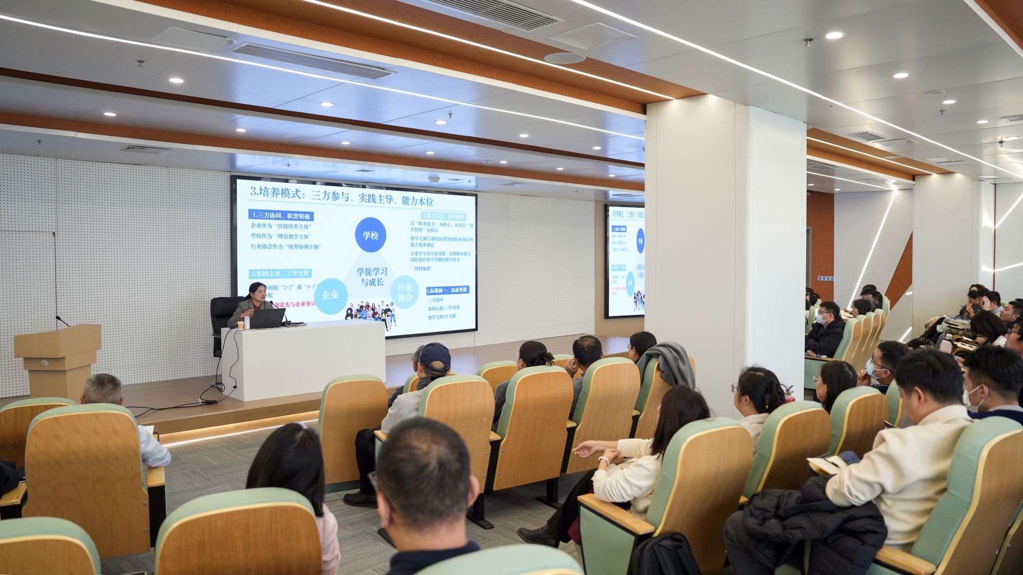 交流会上,李志萍作为国家“工匠之师”创新团队境外研修第十四团团长,以“借鉴瑞士经验,推动职业教育高质量发展”为主题作专题报告。她系统分享了在瑞士研修期间的见闻感悟与学习成果,详细解读了瑞士领先的职业教育体系,重点阐释了“行业、企业、学校”三元协同育人机制的核心逻辑,深入分析其如何实现人才培养与市场需求的精准对接。结合走访瑞士多所应用科学大学、职业院校及知名企业的实践经历,李志萍以鲜活案例生动呈现了瑞士在产教深度融合、基于工作过程的课程重构、“双师型”教师队伍建设等方面的成功经验与关键举措,为与会者带来直观的国际视野与实践启发。