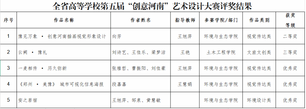 12月17日,全省高等学校第五届“创意河南”艺术设计大赛评审结果揭晓,我校师生共5件作品获奖,分别荣获二等奖1项,三等奖1项,优秀奖3项。