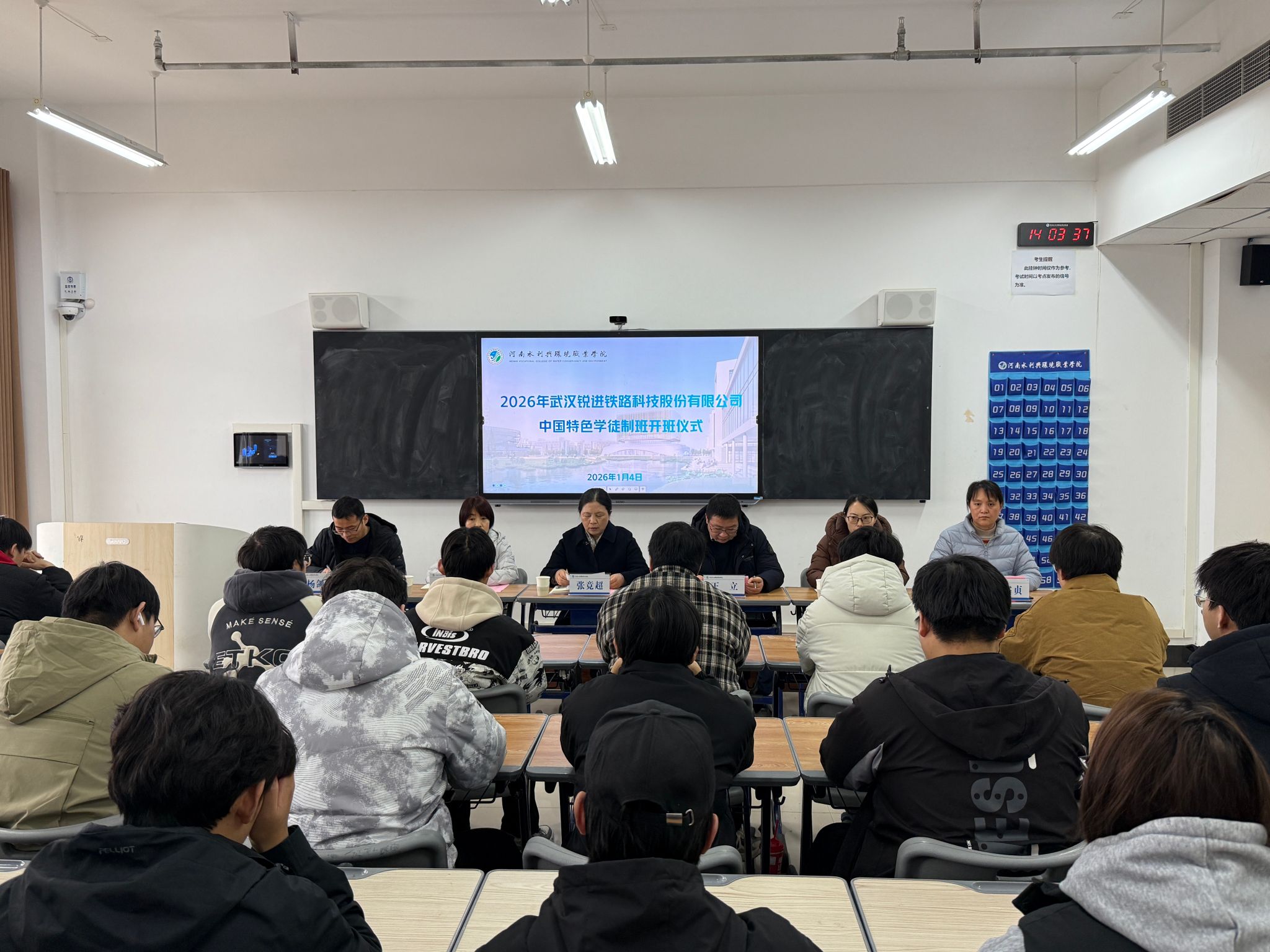 1月4日下午,我校与武汉锐进铁路科技股份有限公司联合举办的“中国特色学徒制班”开班仪式在航空港校区博思楼511举行。副校长张竟超,武汉锐进铁路科技股份有限公司副总经理王立,校企双方代表、相关院系负责人、专业教师及2024级城市轨道交通工程技术、工程测量技术等专业选拔学生共同参加。仪式由交通工程学院副院长芈书贞主持。