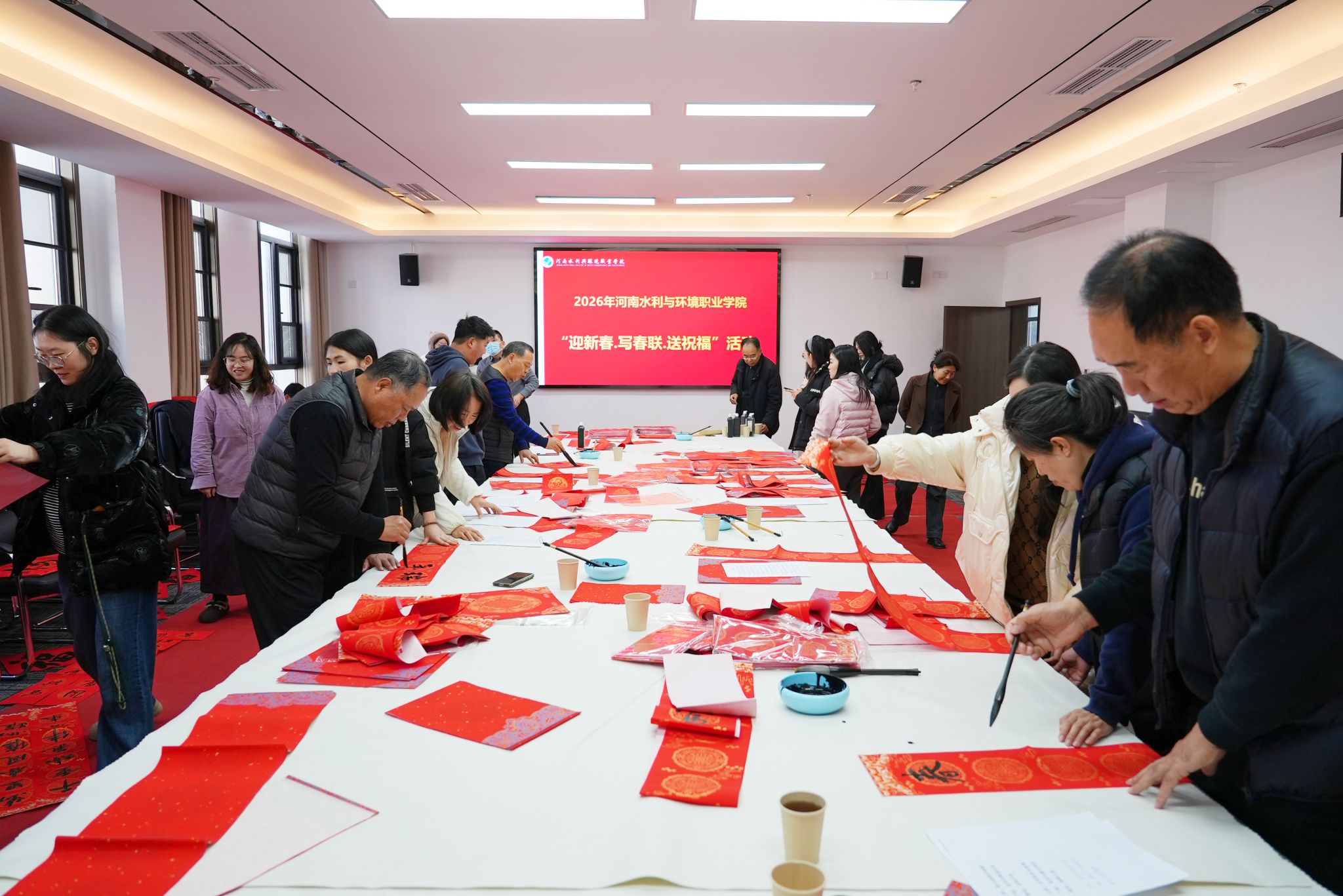 活动特邀河南水利书法协会6位书法家挥毫献艺,我校书法爱好者也踊跃参与、同台创作。活动现场暖意融融,红纸铺展,翰墨飘香。书法家与爱好者们凝神聚气、笔走龙蛇,将平安喜乐、和谐祥瑞的美好寓意融入一撇一捺之中,一副副对仗工整、寓意吉祥的春联,一个个遒劲有力、饱含温度的“福”字跃然纸上,浓浓的年味随着墨香扑面而来。