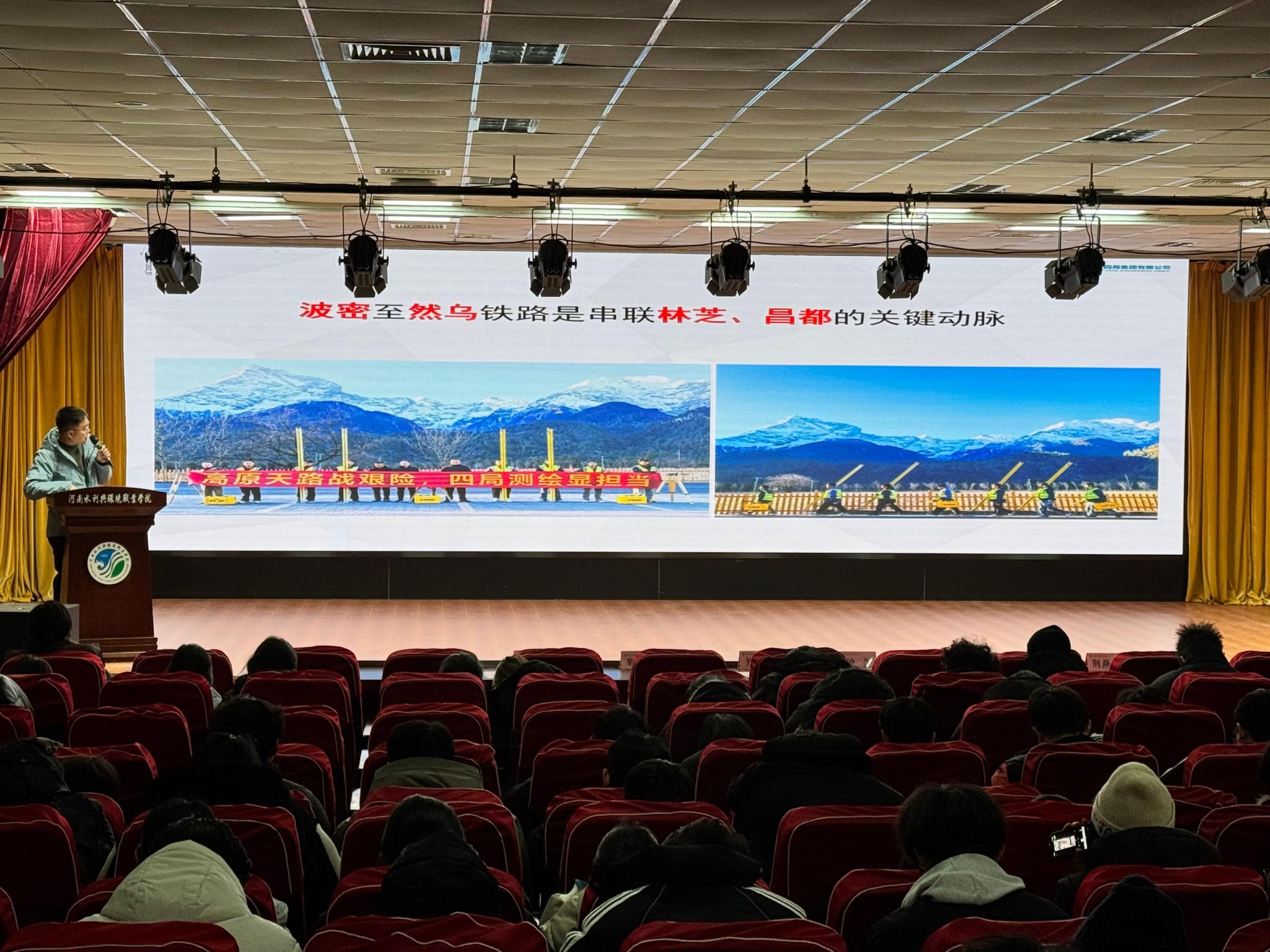 仪式结束后,谨雪朝为学员开展企业文化专题讲座,系统介绍企业发展历程与技术前沿,重点阐述了测绘人员在高速铁路、城市轨道交通等工程中的作用。他以我校毕业生在波密至然乌铁路项目中的突出贡献为例,生动说明了学院人才培养质量与行业需求的高度契合,为学生树立职业自信、明确发展路径提供了指引。