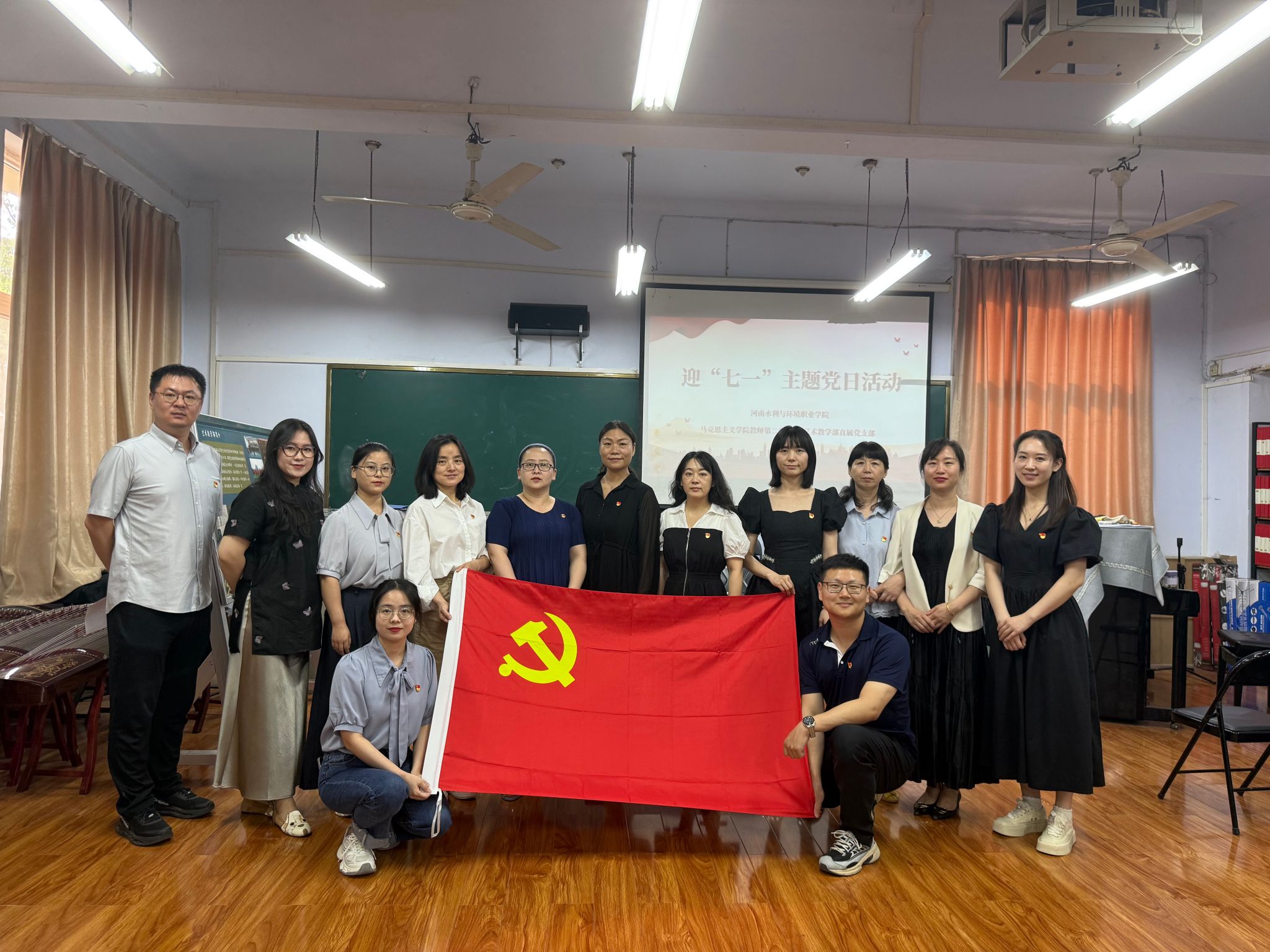 为隆重庆祝中国共产党成立104周年,进一步加强党建引领,促进党建联建,增强党员的使命感、责任感和担当意识,引导广大党员、干部不忘初心、牢记使命。6月20日,马克思主义学院教师第二党支部与艺术教学部直属党支部联合开展迎“七一”主题党日活动。活动由马克思主义学院党总支副书记邵琳主持,学院党总支书记王少娟、艺术教学部直属党支部书记马娇及两个支部全体党员教师参加。