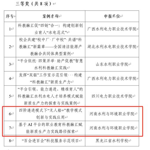 近日,中国水利教育协会公布了水利职业教育“科教融汇”典型案例遴选结果,我校报送的《四阶递进模式下“无人船+”教学模式创新与实践应用》和《基于AI平台的职业教育科教融汇赋能新质生产力实践路径探索》两个案例荣获三等奖。